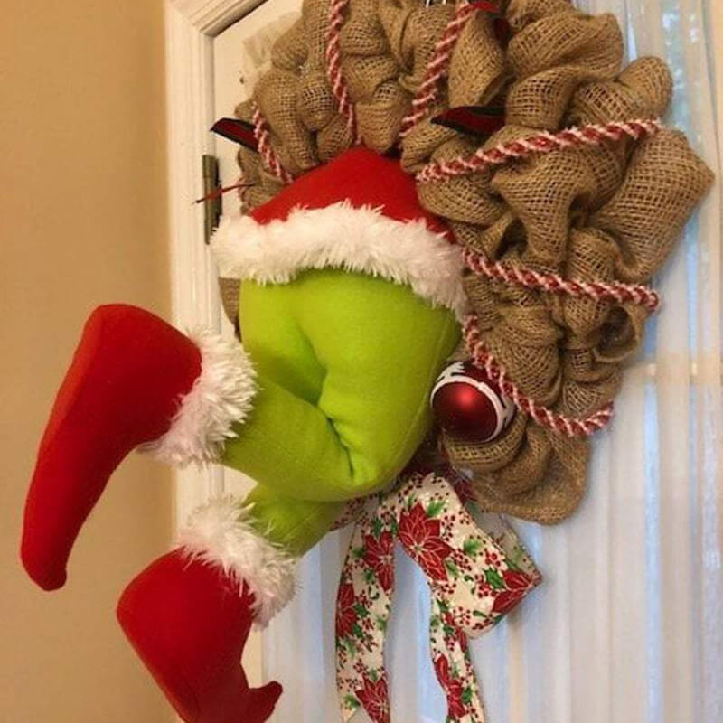 This Grinch inspired wreath will make anyone's heart grow three times in a day! Made with burlap ribbon to look like the Grinch's legs are poking out deep from within Santa's sack! With accents of red and white glitter Christmas ornaments, you can tell the Grinch is up to no good - and stealing Christmas - right on your front door! His plush legs are pose-able, so you can create your own Christmas scene on your wreath! The Grinch is cleverly disguised as Santa himself, to better trick the little Cindy Lu Who of Whoville - what a devil!